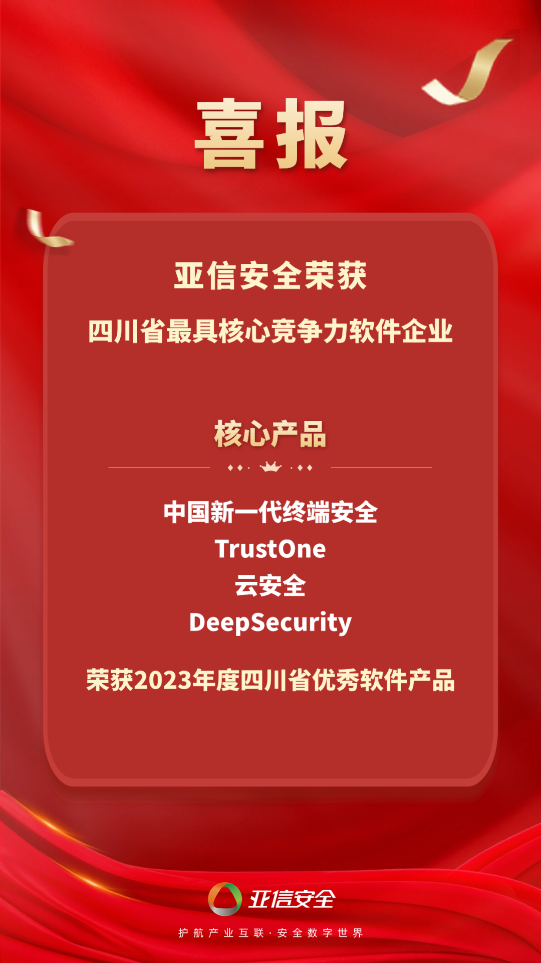 此次揽获名企、名品多项荣誉,既是对亚信安全发展向好、创新向前的充分肯定,更是对亚信安全所具行业影响力、品牌竞争力、人才引领力的有力见证。未来,亚信安全将紧跟行业发展新趋势和新需求,持续发力,进一步夯实云安全与终端安全领导者地位,通过构建“懂网、懂云、懂安全”的一体化能力体系,为四川省软件产业的发展跃升提供支撑,为我国网络安全产业高质量发展贡献力量。
