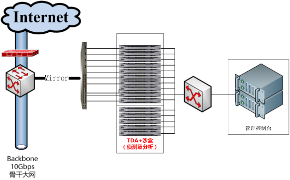 针对正处在日新月异的发展阶段的校园网络,亚信安全建议采用交换机镜像方式旁路部署信桅 深度威胁发现设备TDA,同时将该设备通过互联网接入亚信科技在上海设立的威胁监测中心