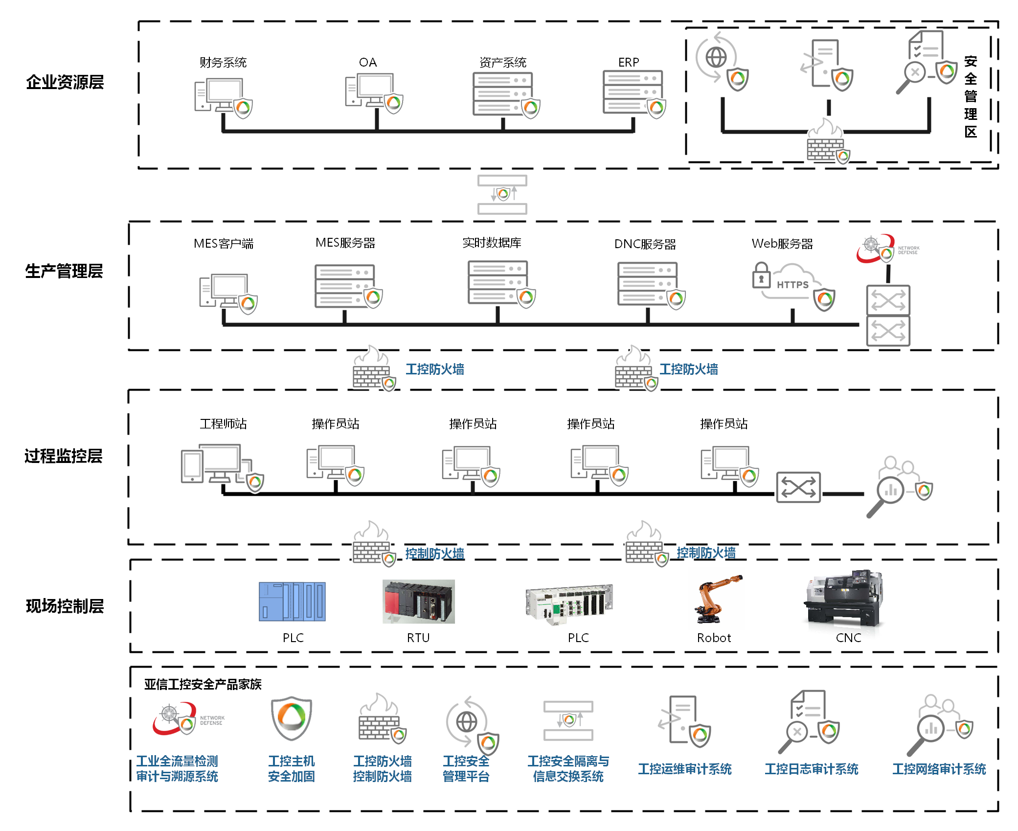 工业控制系统为满足企业数字化转型,逐步打破了原始信息孤岛的形式,生产管理系统MES、仓储管理系统(WMS)与生产控制SCADA/PLC/DNC/CNC/Robot联系越发紧密,也带来一系列安全风险:不可信数据包进入控制系统网,非法身份的用户对控制系统的访问,易受来自办公网或内部其它区域的攻击威胁。工业控制系统采用标准的TCP/IP通讯协议与软硬件系统,将数据共享至工业控制系统之外的系统,为工业生产带来极大推动作用的同时,也带来了诸多工控系统的安全问题,如:网络边界模糊、TCP/IP协议自身安全问题、工业组态软件与控制器漏洞、工控机系统漏洞、工业病毒攻击、未经授权访问、非法网络嗅探、APT攻击、僵尸网络威胁等等网络安全风险和漏洞。同时以往的IT网络安全防护技术已不能适应现有的工业控制系统安全防护需求(如无法实现OPC动态端口协议以及其他工业协议深度解析的安全防护需求),可见工业控制系统安全道路任重,刻不容缓!